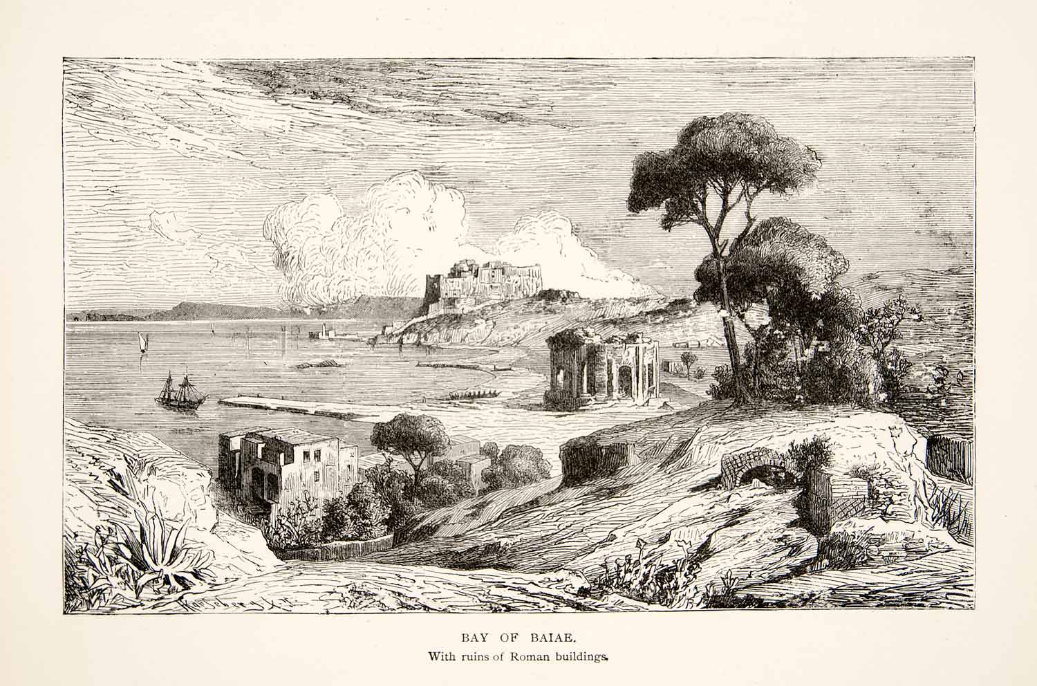 This is an original 1886 black and white in-text wood engraving of the Bay of Baiae (Baia) which is located in the region of Campania, Italy. In ancient times, it was the location of a seaside resort.