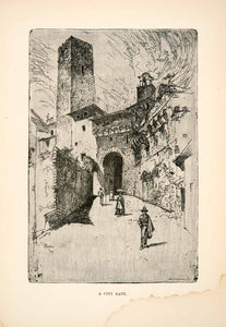 This is an original 1886 black and white wood engraving of the City Gate to Siena, Italy.