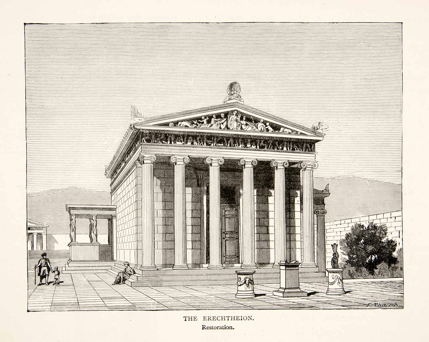 This is an original 1886 black and white in-text wood engraving of the ancient Greek temple knowns as the Erechtheion which is located on the north side of the Acropolis of Athens, Greece. This structure was built between 421 and 405 BC. It is famous for the Porch of the Caryatids.