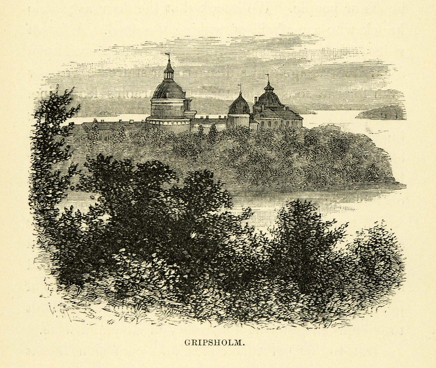 This is an original 1886 black and white wood engraving of Gripsholm Castle in Mariefred, Södermanland, Sweden (Sverige). The castle was built in the 14th century by Bo Jonsson Grip, and belonged to his family until confiscated by King Gustav I in 1526. Please note the dimensions of this image.