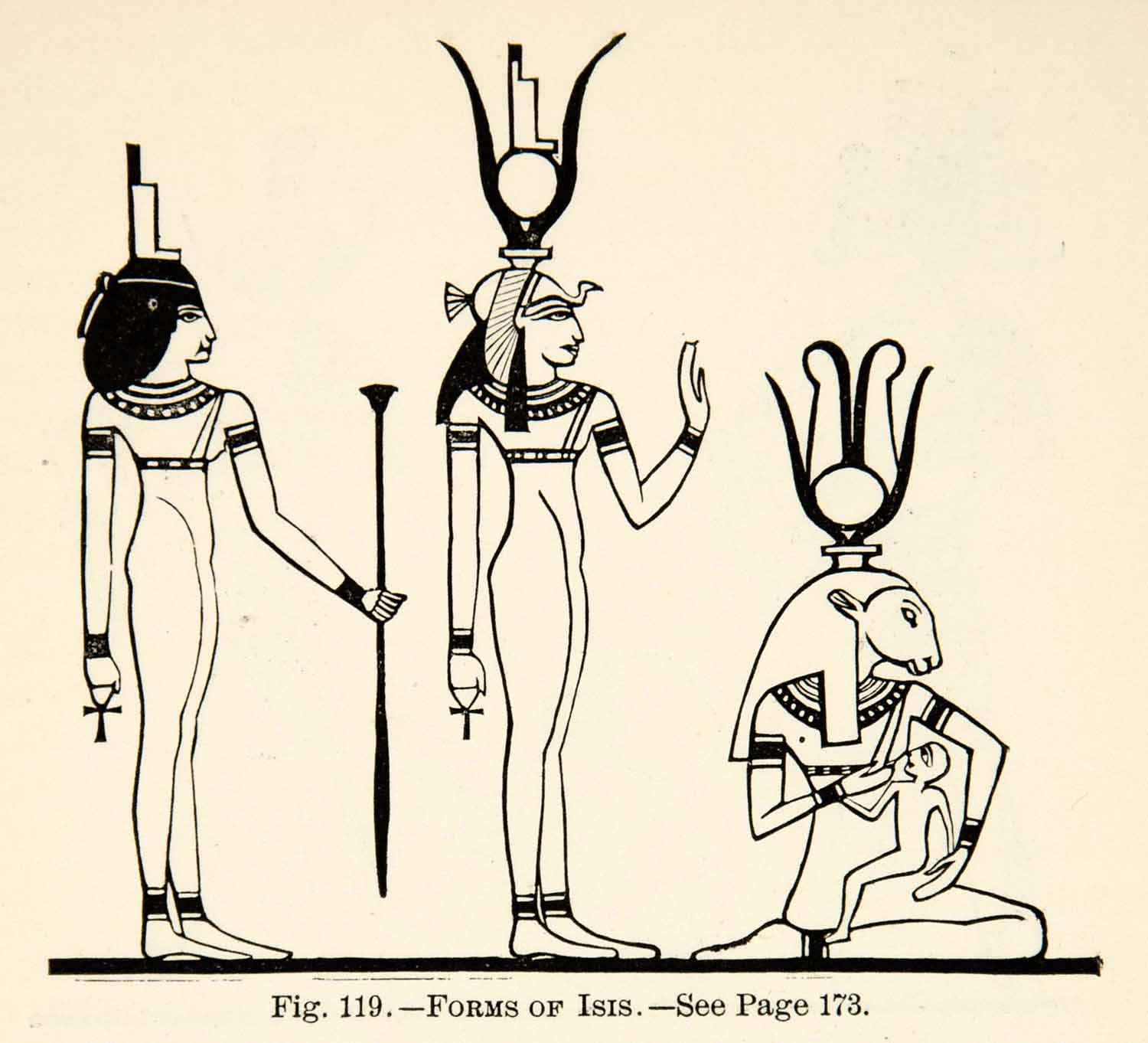 This is an original 1886 black and white in-text wood engraving of the forms of Isis. Isis was a goddess in Ancient Egypt who was worshipped as the ideal mother and wife as well as the patron of nature and magic.