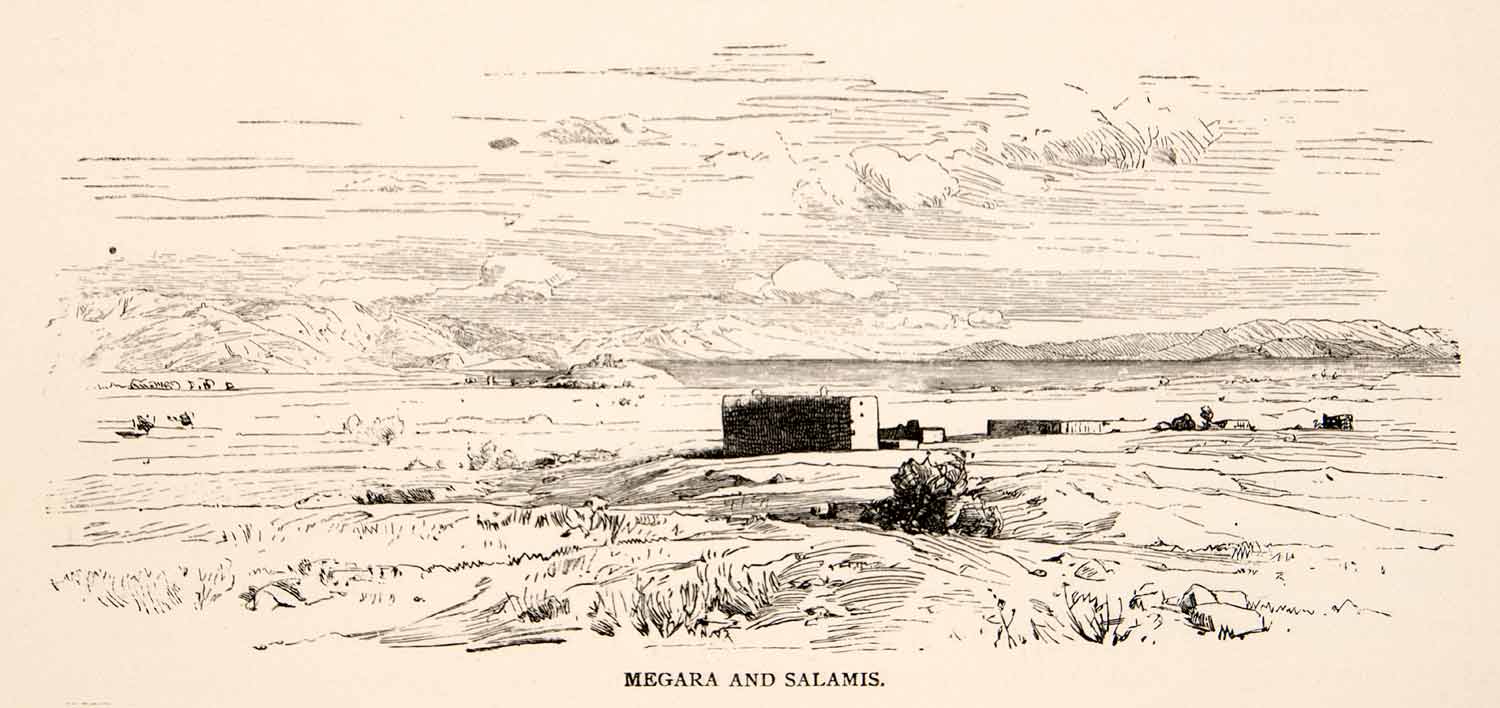 This is an original 1886 black and white in-text wood engraving of the ancient city of Megara in Attica, Greece. It is not far from the island of Salamis on the northern section of the Isthmus of Corinth. At one time, Megara was a successful trade port.