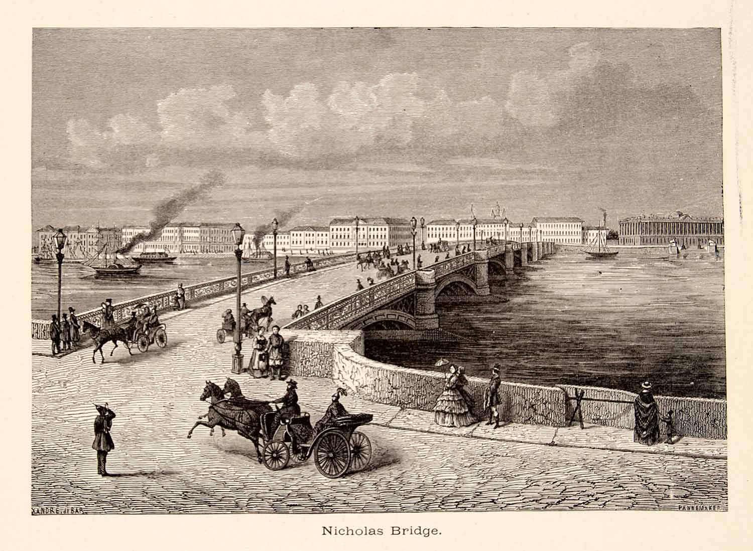 This is an original 1886 black and white in-text wood engraving of the Nicholas Bridge in St. Petersburg, Russia.
