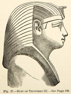 This is an original 1886 black and white in-text wood engraving of the bust of Thothmes III, who was the 6th Pharaoh of the 18th dynasty.