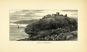 This is an original 1886 black and white wood engraving of the ruins of the Hammershus-- northern Europe's largest medieval fortress. The ruins are located on the northern tip of Bornholm in Denmark (Danmark).