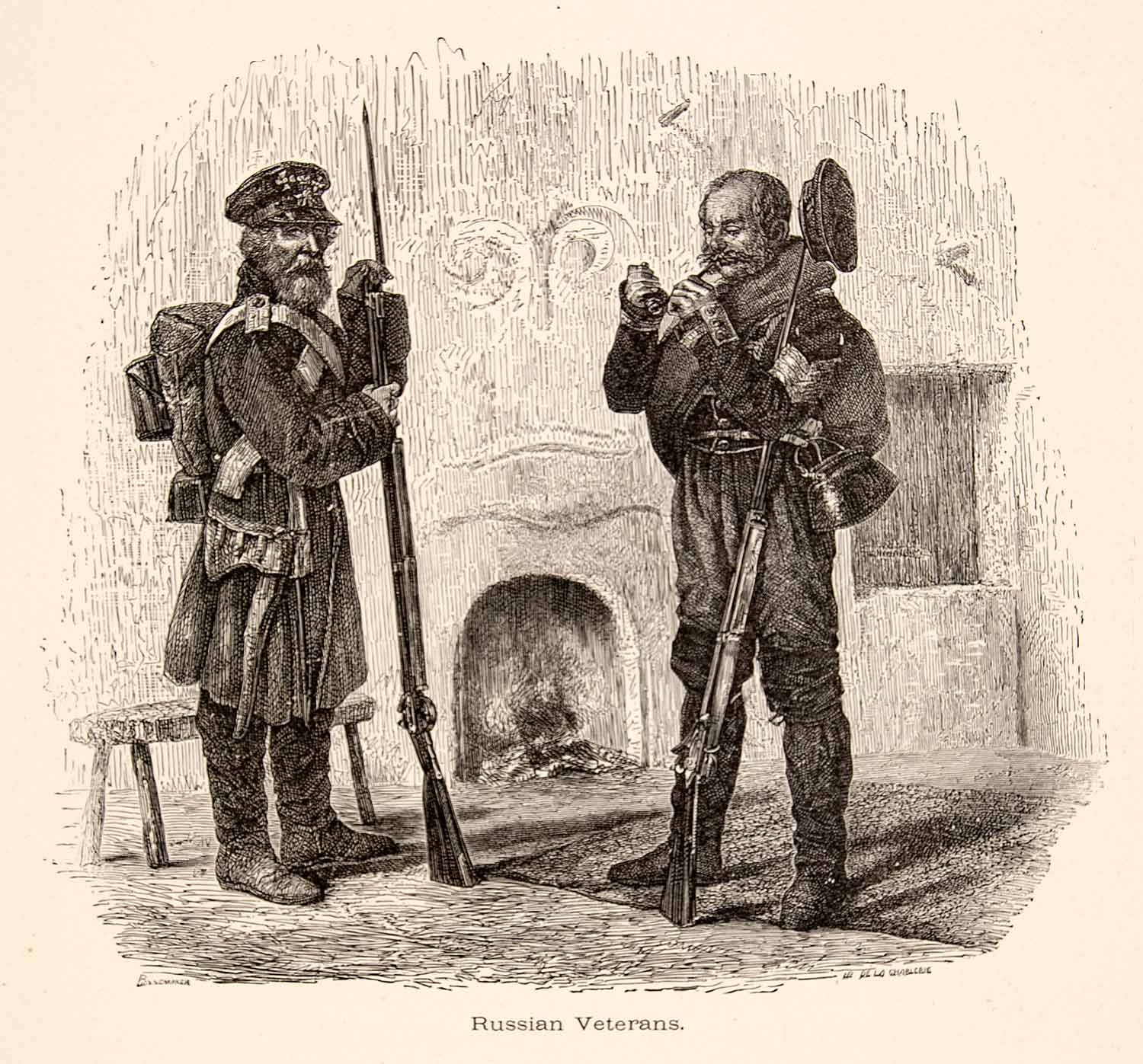 This is an original 1886 black and white in-text wood engraving of Russian Veterans in their uniforms.