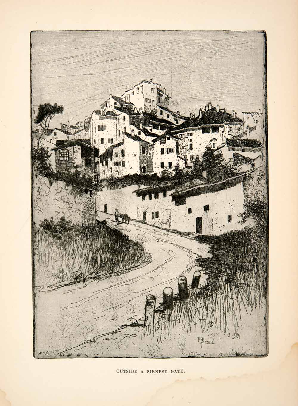 This is an original 1886 black and white wood engraving of the outside of a Sienese Gate in Italy.