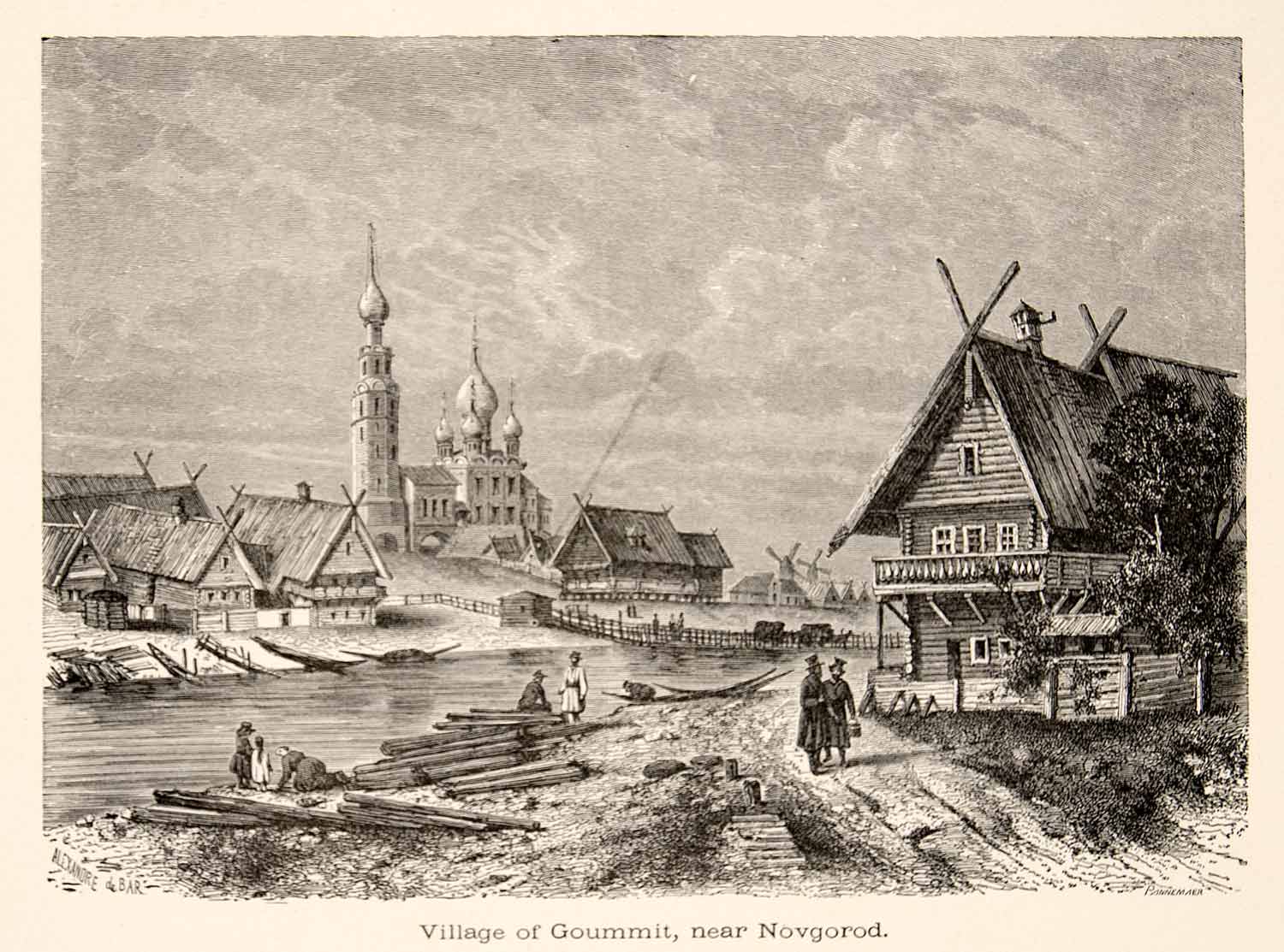 This is an original 1886 black and white in-text wood engraving of the village of Goummit near Novgorod in Russia.