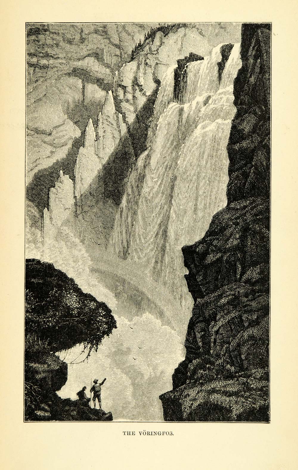 This is an original 1886 black and white wood engraving of the Vöringfos waterfall in Norway (Norge). Unfortunately, we are unsure as to the exact location of this waterfall.