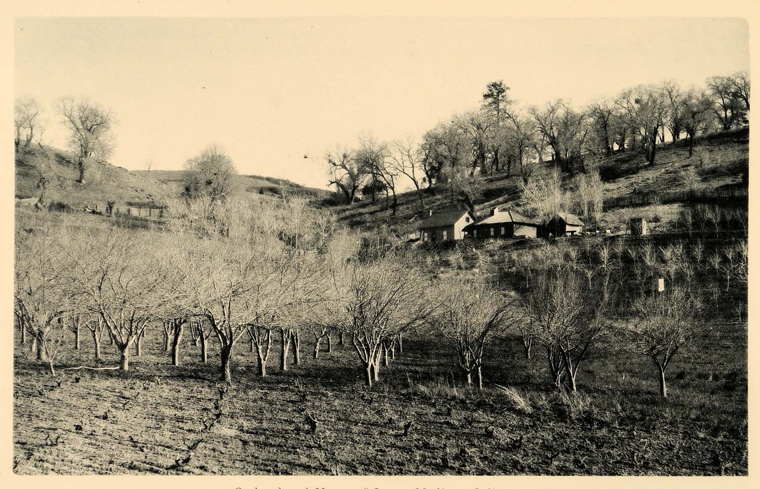 This is an original 1887 photogravure of the orchard and home of James Madison in Julian, San Diego County, California.