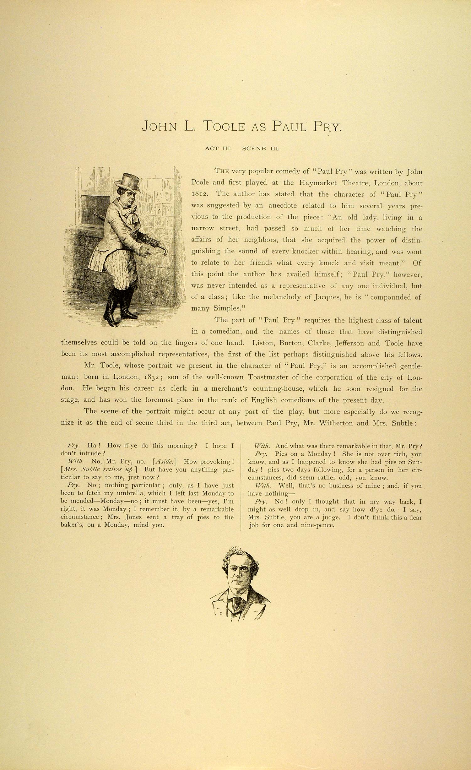 This is an original 1887 photogravure of English actor, John Lawrence Toole (1830-1906) in the title role of John Poole's comedy play, Paul Pry, Act III, Scene III. Attached is a brief descriptive note about the actor and an excerpt from the scene --please see both images.