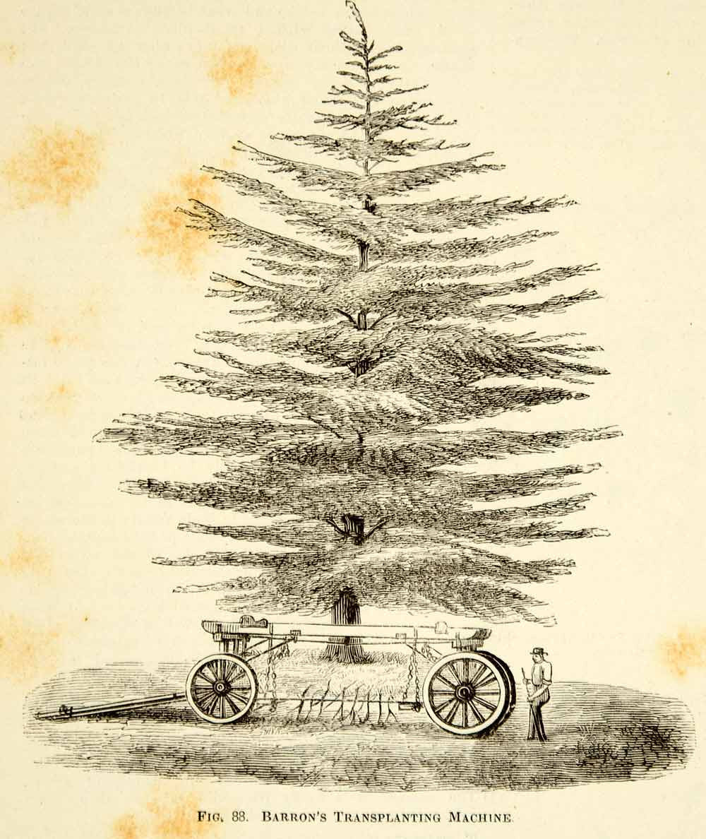 This is an original 1887 black and white wood engraving of Barron's tree transplanting machine.