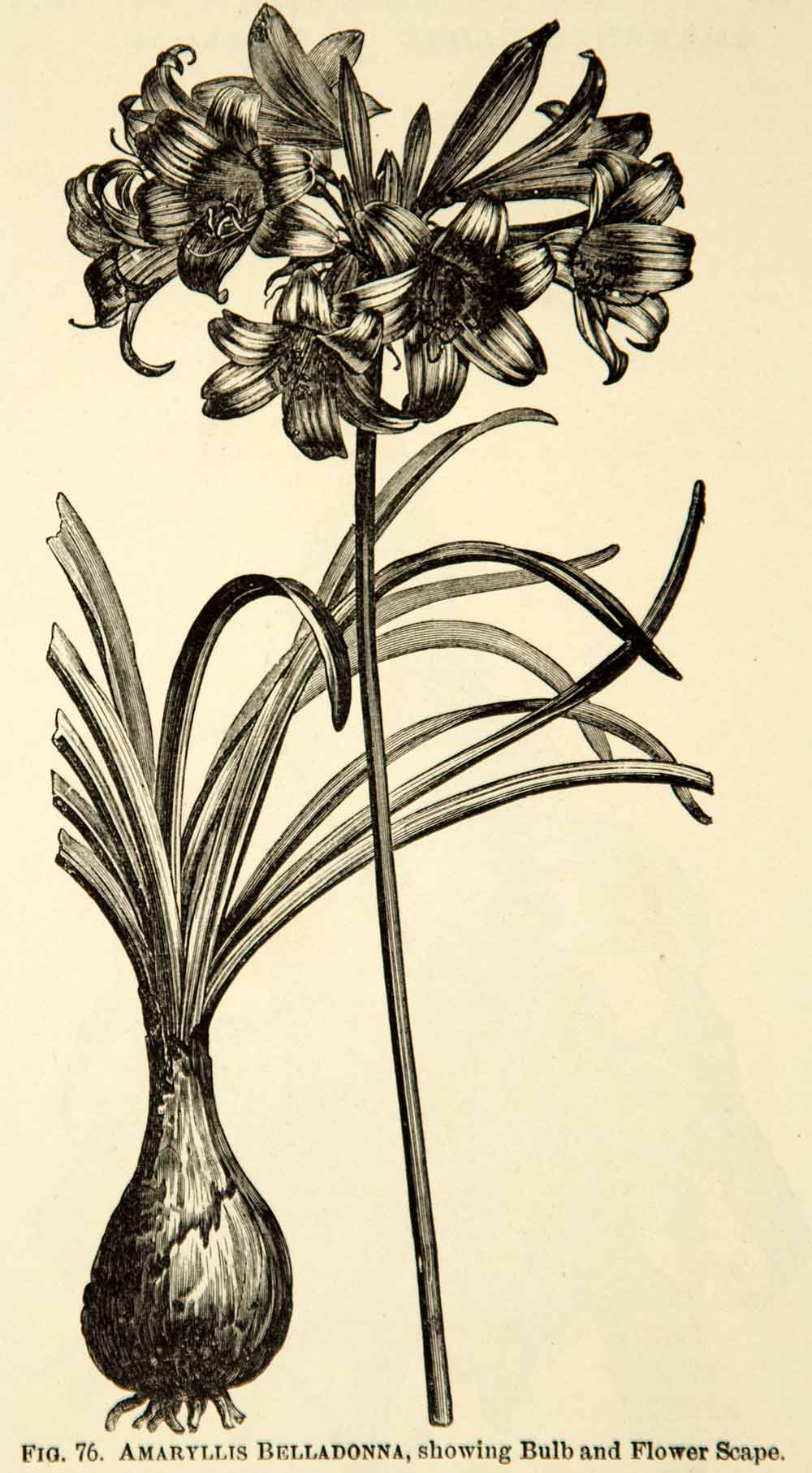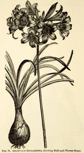 This is an original 1887 black and white wood engraving of the Amaryllis belladonna, also known as the Naked Lady Lily, that is native to South Africa.