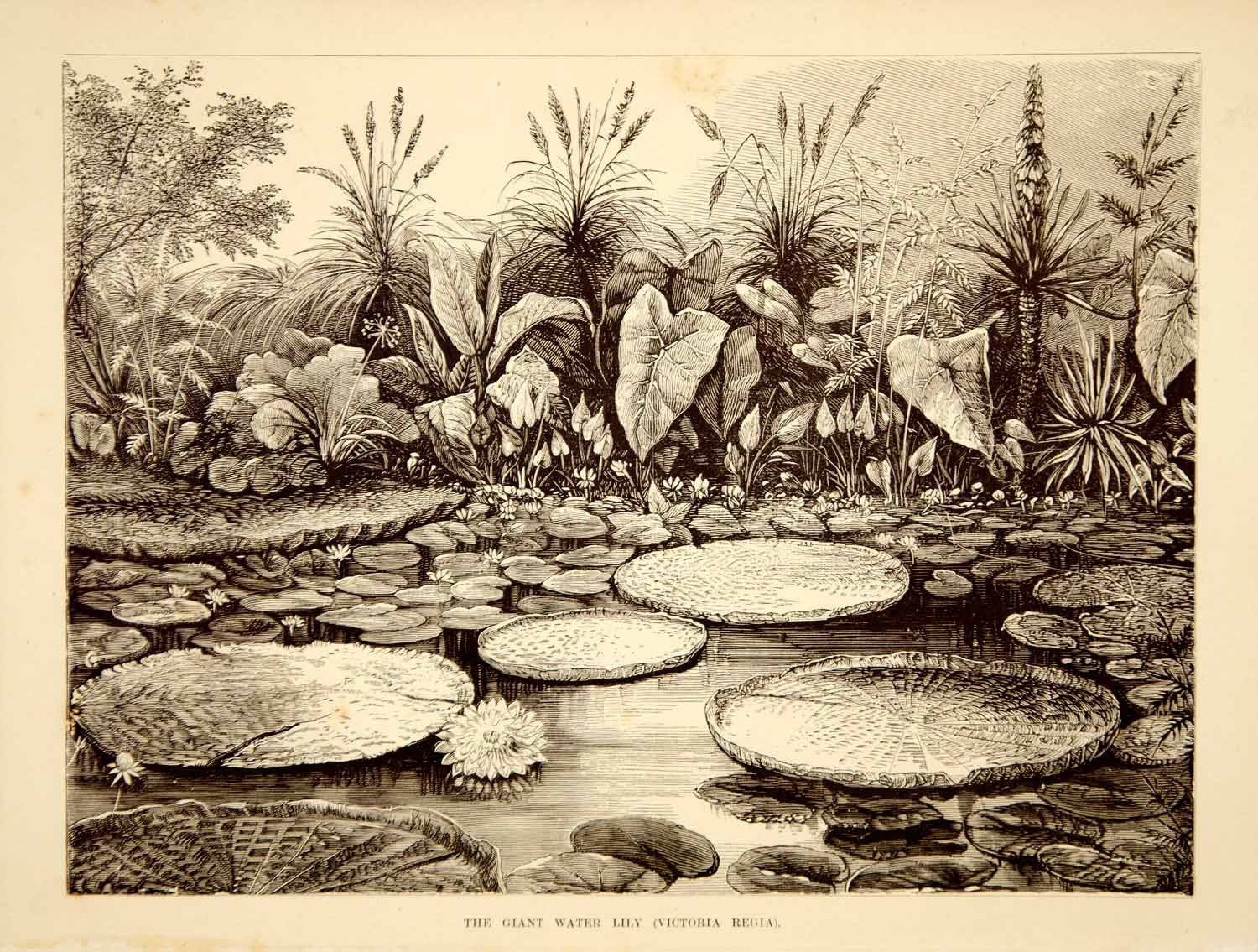 This is an original 1887 black and white wood engraving of the Victoria amazonica, better known as Queen Victoria's Water Lily, that is the largest of the Nymphaeaceae family of water lilies, growing up to three meters in diameter. The plant is native to the Amazon River basin in South America.