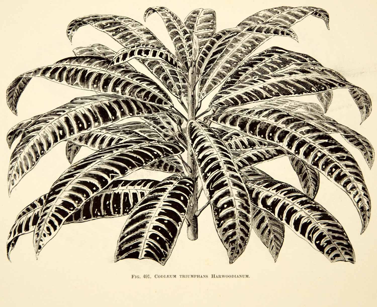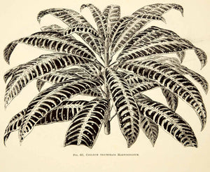 This is an original 1887 black and white wood engraving of the Codleum triumphans harwoodianum plant.