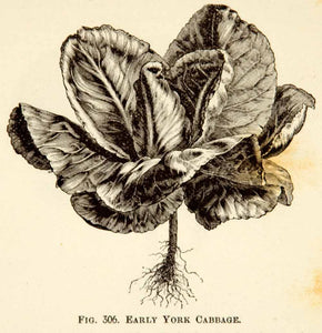 This is an original 1887 black and white wood engraving of the Early York Cabbage plant.