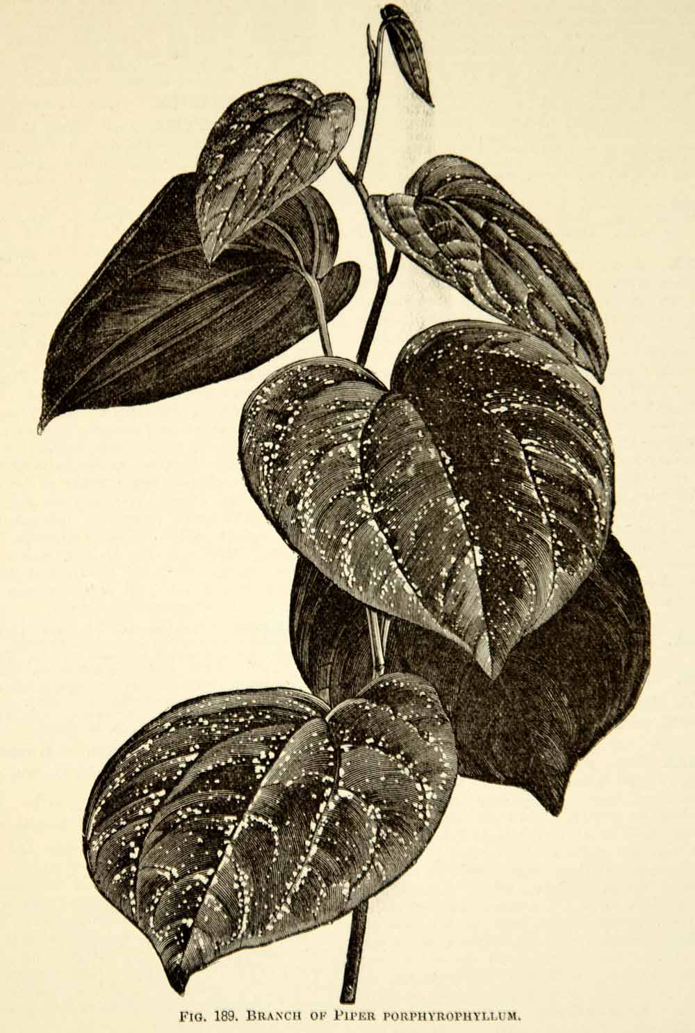 This is an original 1887 black and white wood engraving of Piper porphyrophyllum or Tiger's Betel.