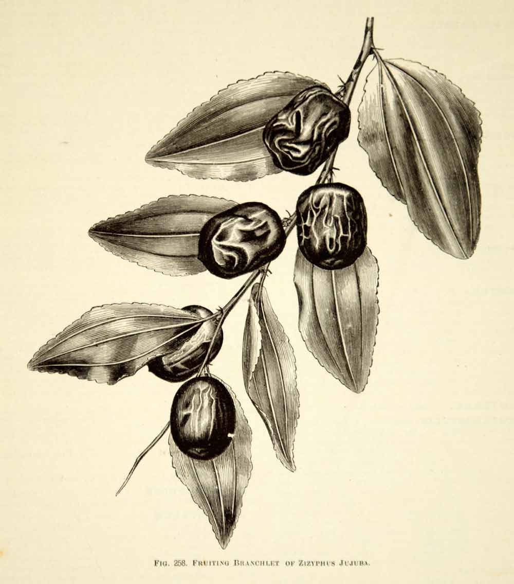 This is an original 1887 black and white wood engraving of Ziziphus jujuba, commonly known as Jujube, Red Date, Chinese Date, Korean Date, or Indian Date, that is native to southern Asia.