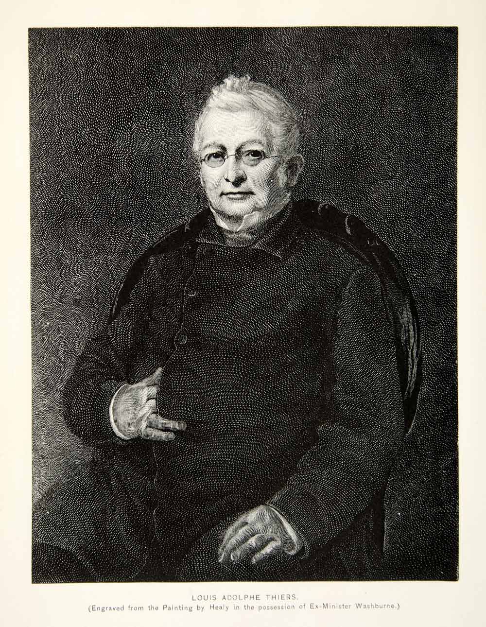 This is an original 1887 black and white wood engraving of a portrait of Louis Adolphe Thiers, a prominent politician and statesman in France during his lifetime between 1797-1877 CE.