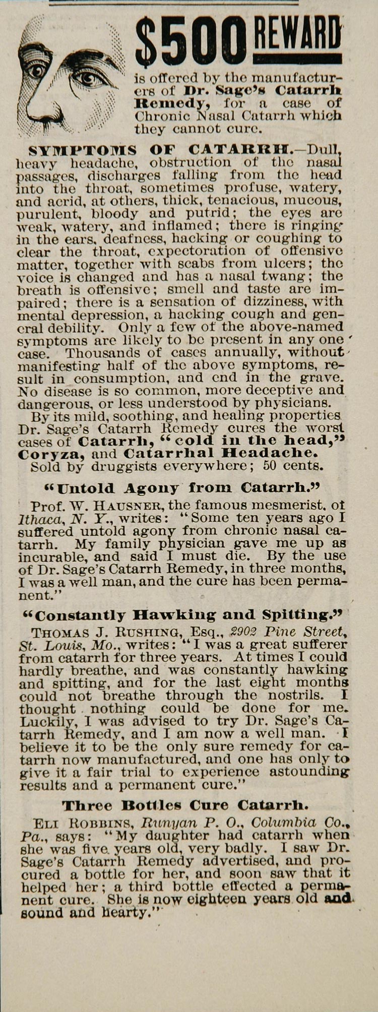 This is an original 1888 black and white print ad for Dr. Sage's Catarrh Remedy, a cure for catarrh and its resulting problems like deafness with testimonials from cured patients.