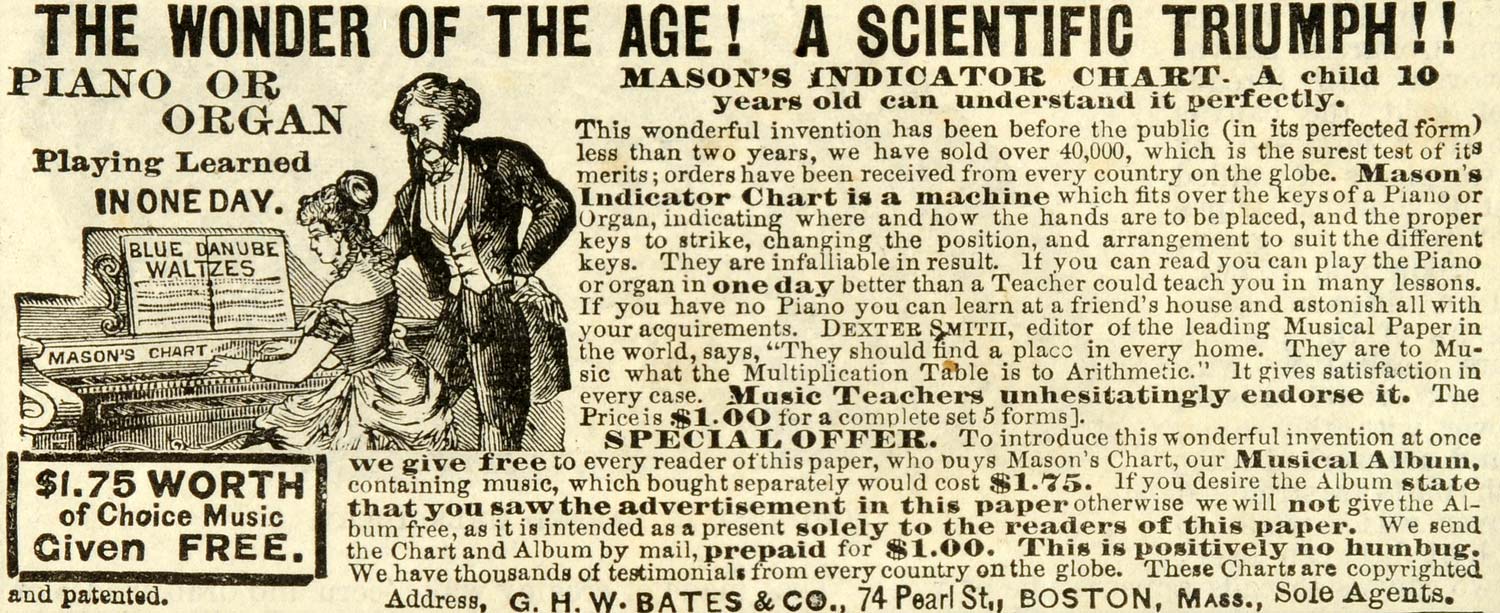 This is an original 1888 black and white print ad for the Manson's Indicator Chart from G. H. W. Bates and Company located at 74 Pearl Street, Boston, Massachusetts.