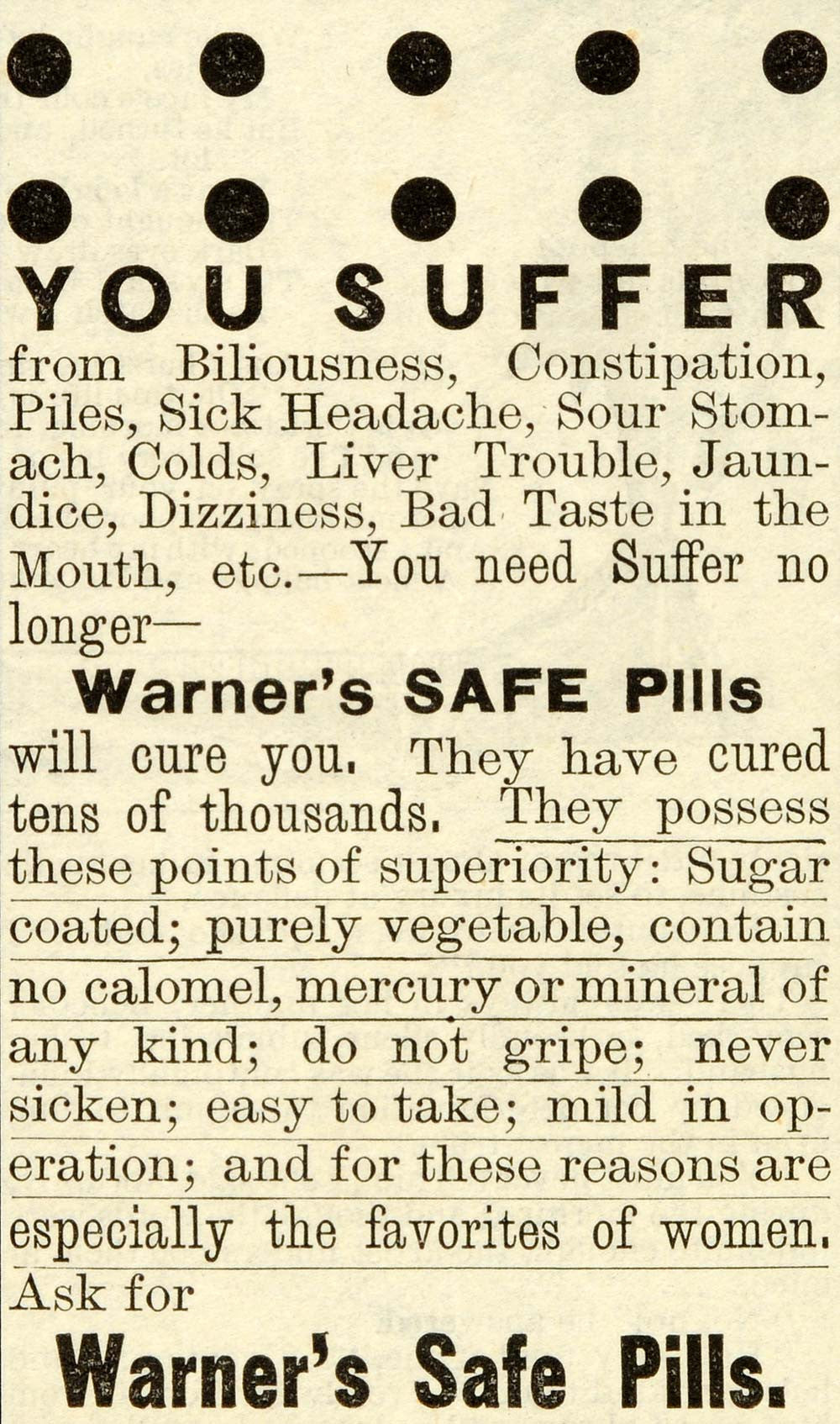 This is a small original 1888 black and white print ad for the Warner's Safe Pills treating constipation, piles, headaches, cold, etc.