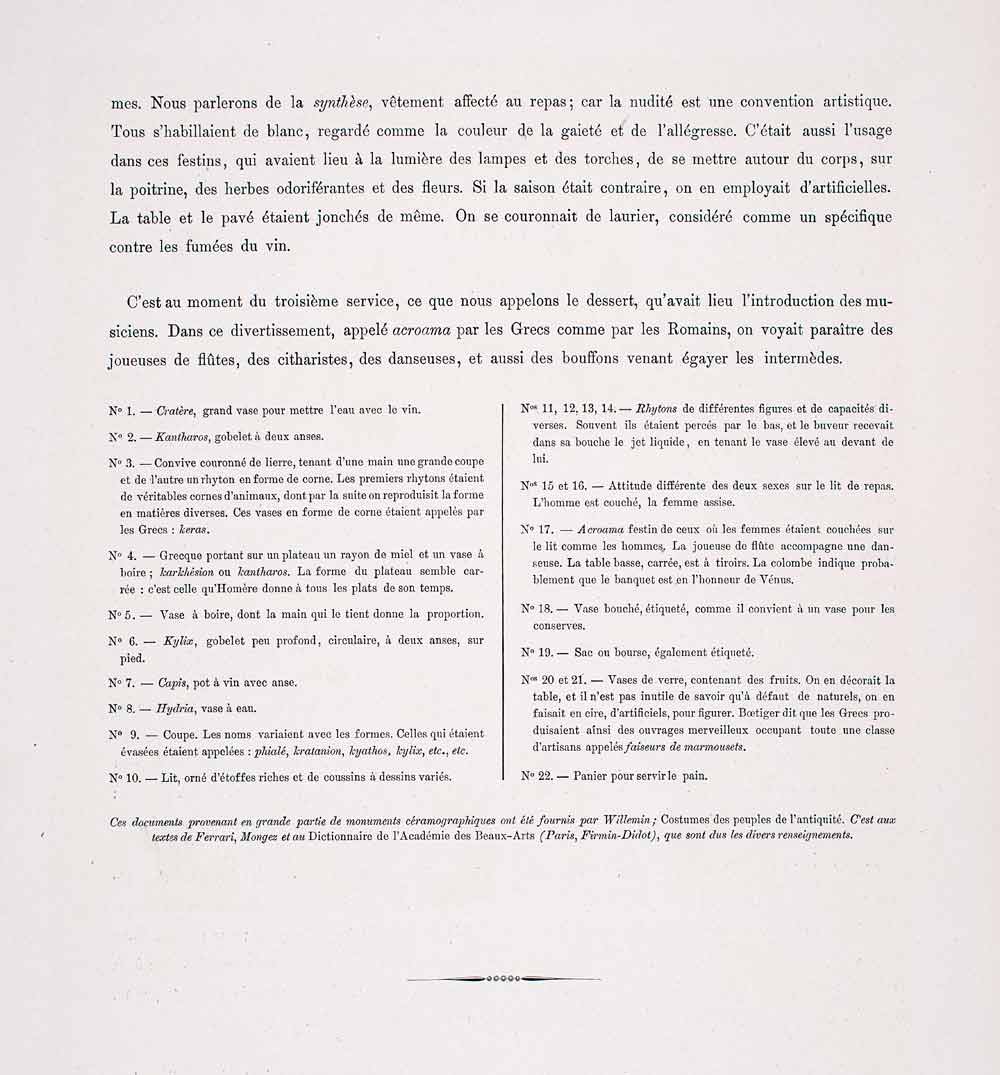 Bottom - 15,16. The proper way each gender was expected to act, with the male reclined and the female (most likely his wife) seated at the foot of the couch - 17. Acroama, where the women were allowed to recline with the men. The dove suggests that this feast was in honor of Venus - 18. Ceramic jar, labeled - 19. Small purse, labeled - 20,21. Glassware filled with fruit, as a centerpiece. In absence of real fruits, wax or ceramic replicas would be used - 22. Bread basket.