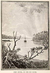 This is an original 1888 black and white halftone print of Port Spicer on the Fly River in the country of Papua New Guinea. This river is the second longest river in that country and the largest in the world without a single dam in it.