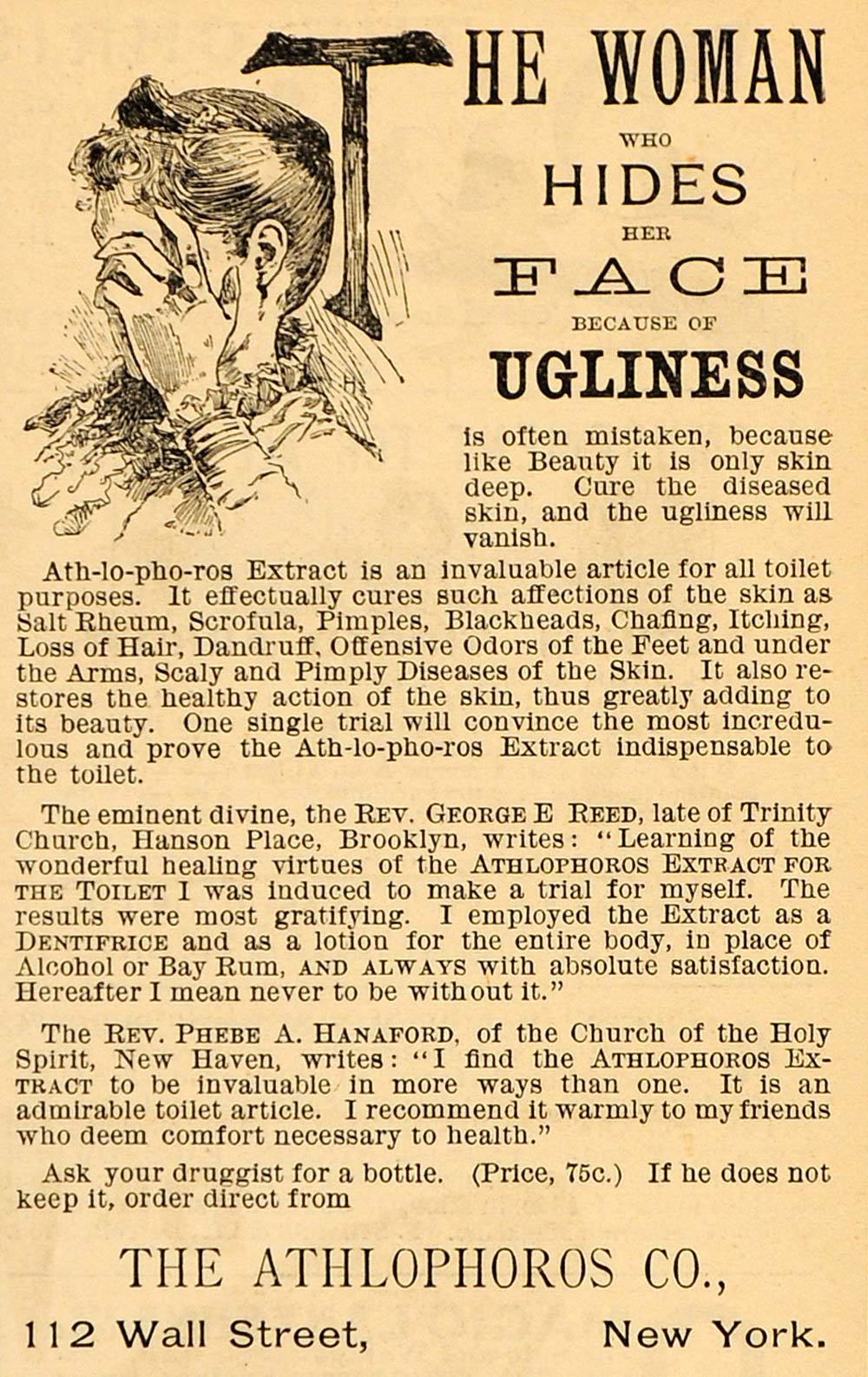This is an original 1888 black and white print ad for Althophoros Extract, a beauty treatment for the skin from The Athlophoros Co., 112 Wall Street, NYC.