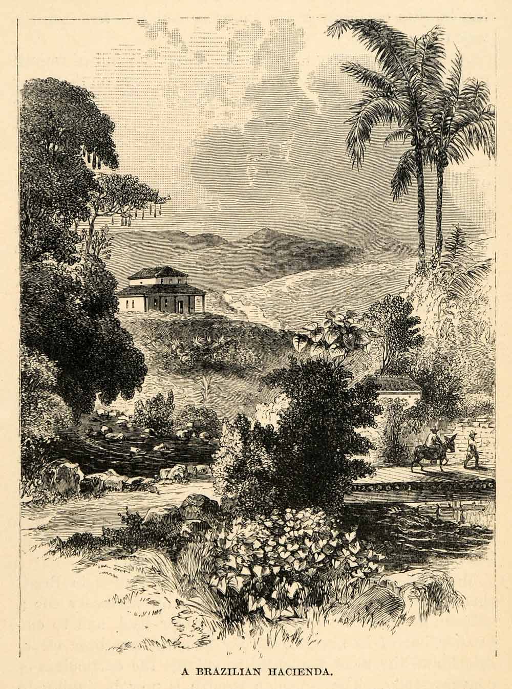 This is an original 1888 black and white in-text wood engraving of a hacienda in Brazil, South America.