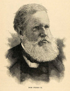 This is an original 1888 black and white in-text wood engraving of Don Pedro II nicknamed "The Magnanimous." He was the second and final ruler of the Empire of Brazil.