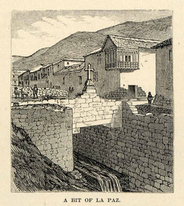 This is an original 1888 black and white in-text wood engraving of a bit of La Paz in Bolivia, South America.