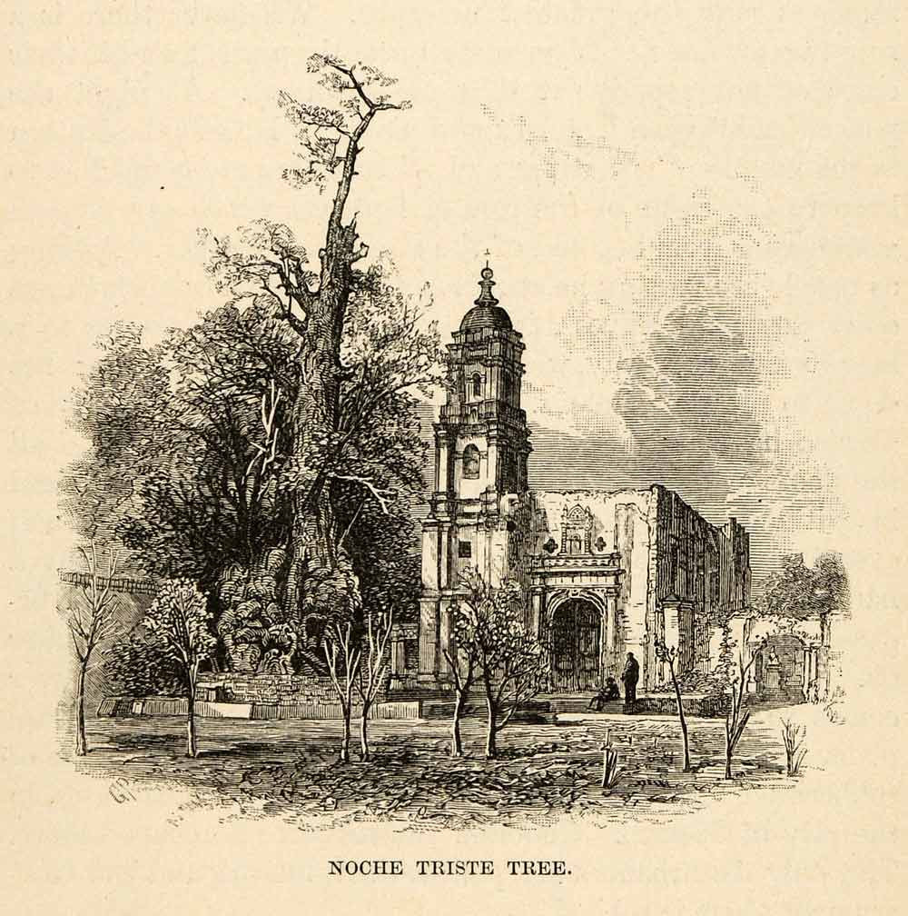 This is an original 1888 black and white in-text wood engraving of Noche Triste (Sad Night) Tree. This area got it's name on account of the sorrow that Cortez and his surviving followers felt and expressed at the sight of the loss of life and treasure in the escape from Tenochtitlan, Mexico.