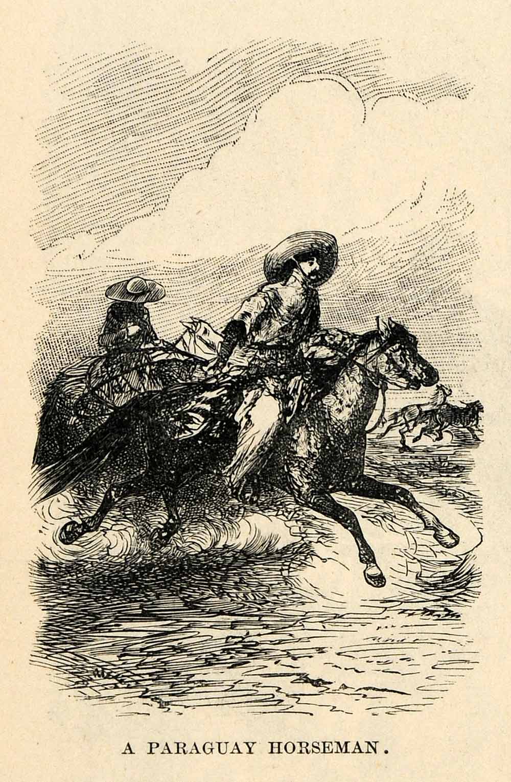 This is an original 1888 black and white in-text wood engraving of a Paraguayan horseman.