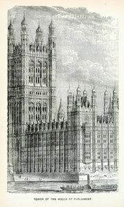 This is an original 1888 black and white wood engraving of the tower of the House of Parliament (Westminster Palace). This Parliament building sits on the River Thames and has three towers. The tower pictured is the Victoria Tower.