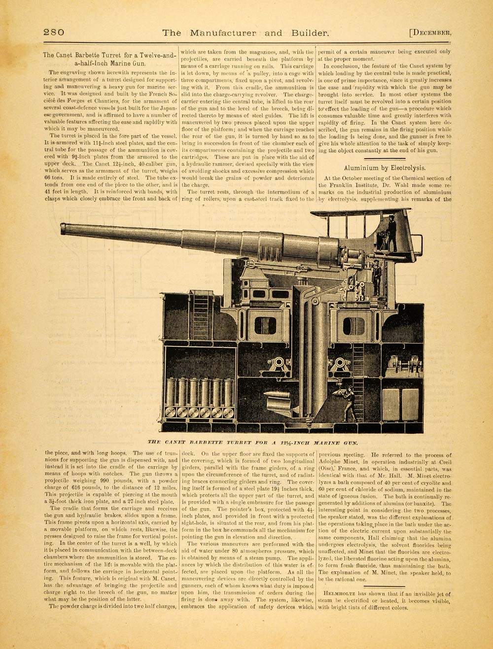 This is an original 1889 half-page print article "Canet Barbette Turret for a Twelve-and-a-half-inch Marine Gun", with an illustration of the turret. This halftone image shows the interior arrangement of a turret designed for supporting and maneuvering a heavy gun for marine service. It was designed and built by the French Societe des Forges et Chantiers, for the armament of several coast defense vessels just built for the Japanese Government.