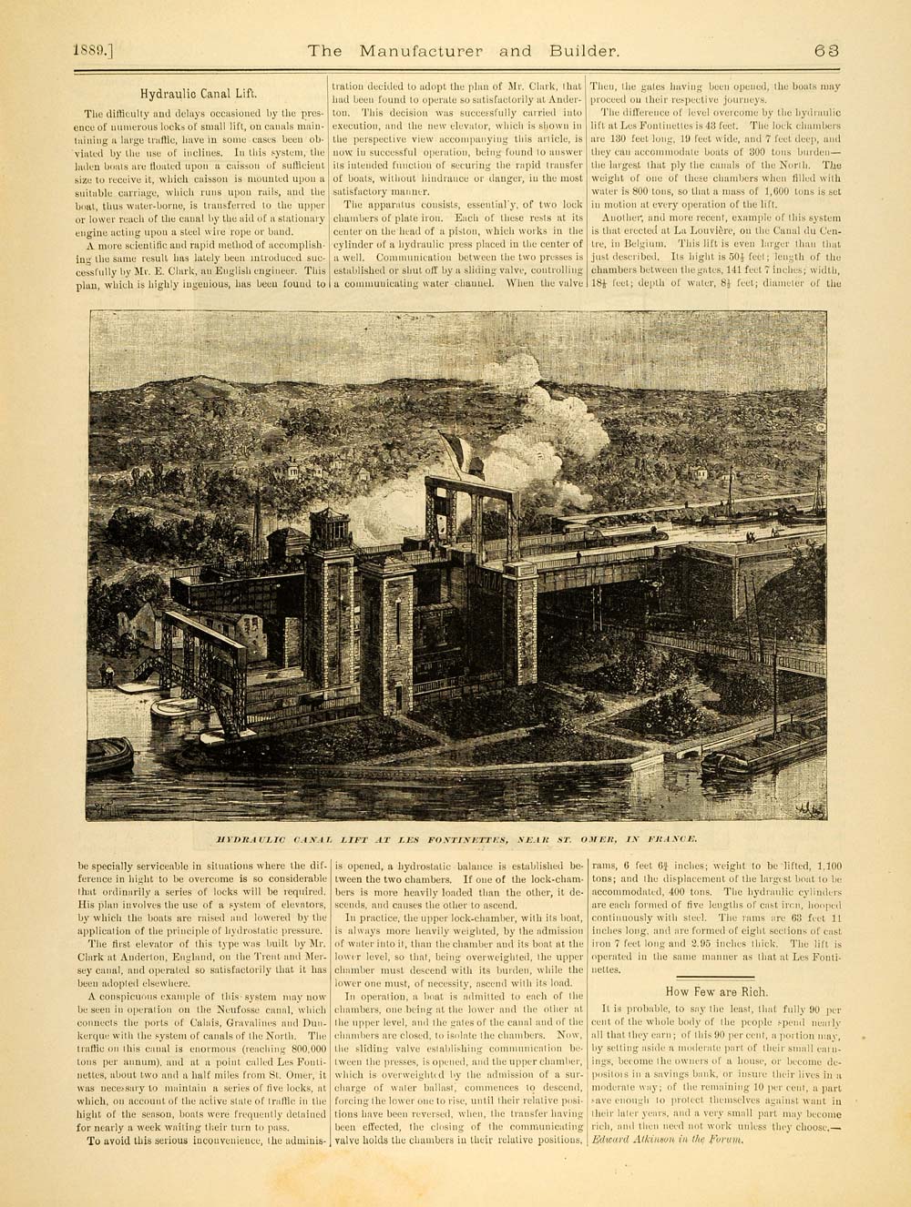 This is an original 1889 one-page article about hydraulic canal lifts with a halftone illustration of the Hydraulic Canal Lift on the Canal de NeufossŽ at Les Fontinettes, near St. Omer, France.