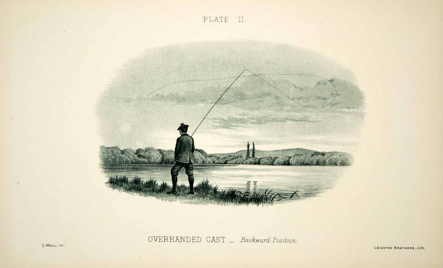 This is an original 1889 grayscale chromolithograph of an illustration by D. Moul entitled, "Overhanded Cast - Backward Position", that depicts an angler performing a proper overhanded cast.