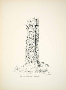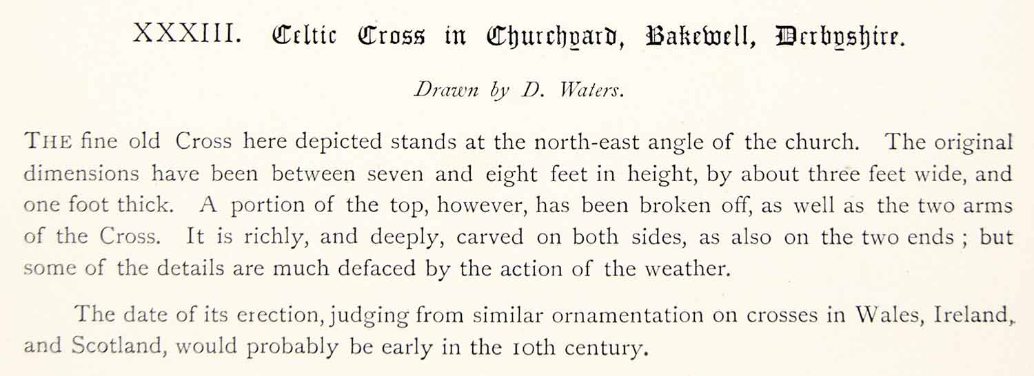 This is an original 1889 black and white lithograph of a drawing by D. Waters of an early 10th century Celtic cross from the churchyard of All Saints Church in the market town of Bakewell in Derbyshire, England, United Kingdom.