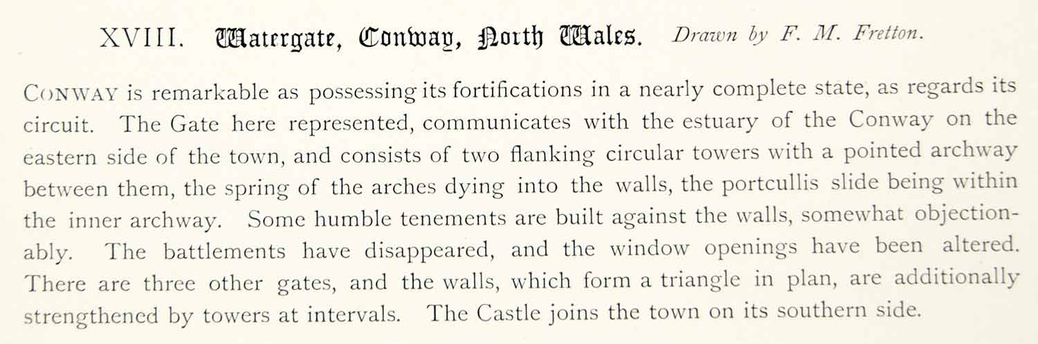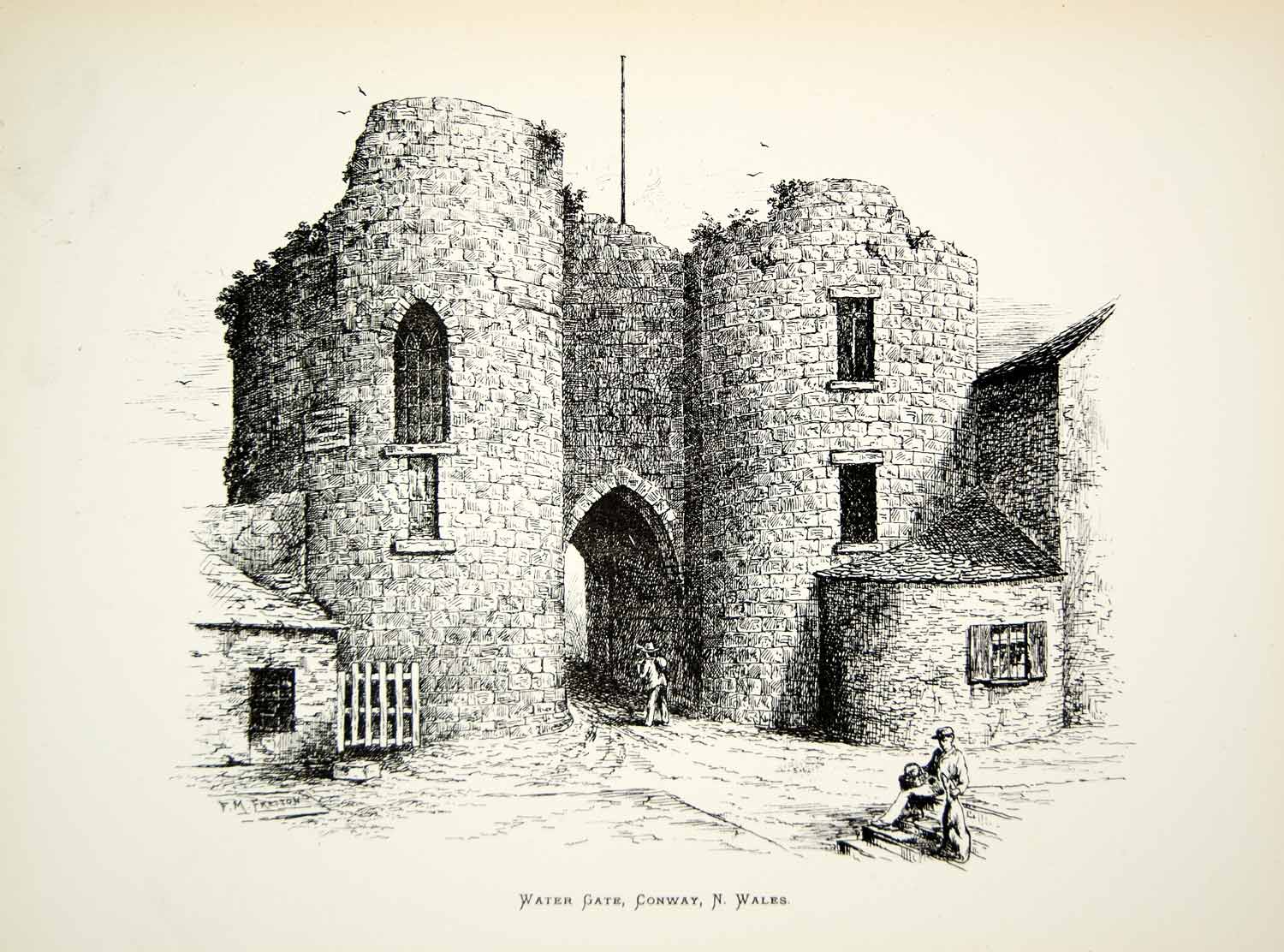 This is an original 1889 black and white lithograph of a drawing by Francis M. Fretton of the historic Water Gate in town walls of Conwy in Wales, United Kingdom. The town wall were built by King Edward I of England between 1283 and 1289 CE.