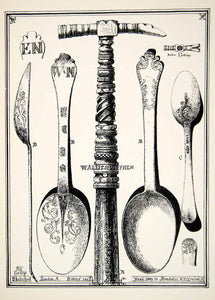 This is an original 1889 black and white lithograph of a drawing by James Thomas Irvine of a wrought steel hammer, silver spoons, and a silver tea spoon from historic England.