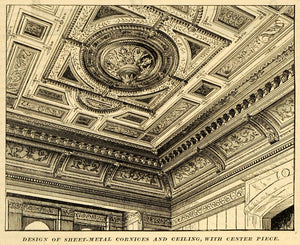 This is an original 1889 halftone print of sheet metal cornices and ceiling, with a ornate center piece, manufactured by Bakewell & Mullins of Salem, Ohio.