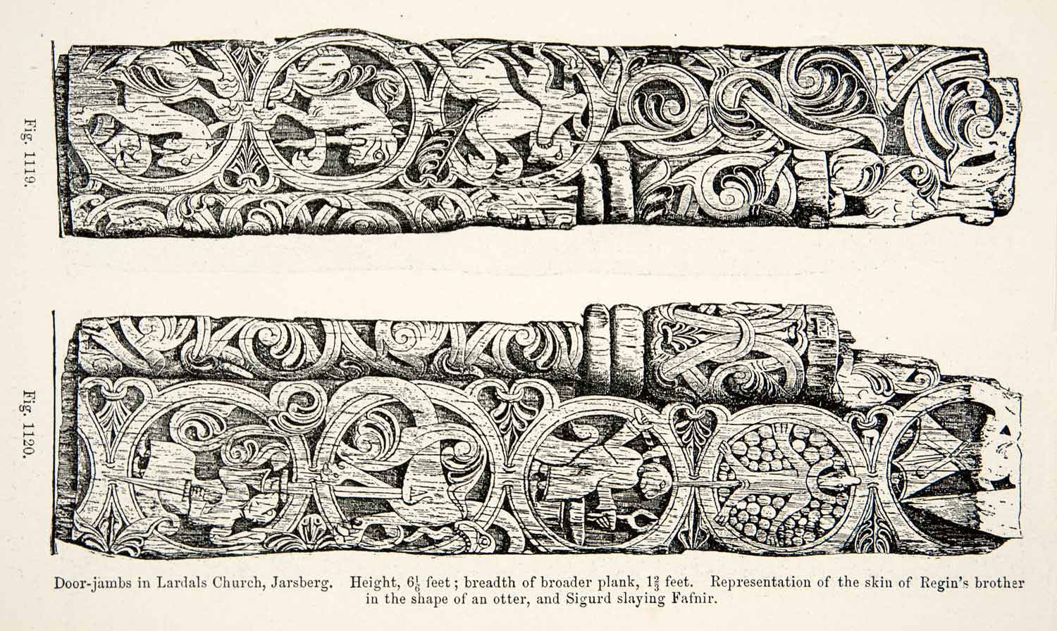 This is an original 1889 black and white in-text wood engraving of "Door-jambs in Lardals Church, Jarsberg." There is representation of REgin's brother in the shape of an otter, and Sigurd slaying Fafnir.