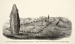 This is an original 1889 black and white in-text wood engraving of "Rectangular Stone-set Graves with Bautastones."