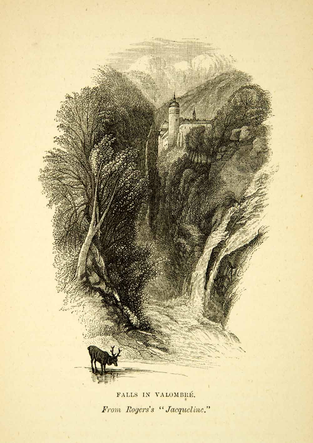 1889 Wood Engraving Turner Waterfall River Cascade Valombre France Deer XAZ9