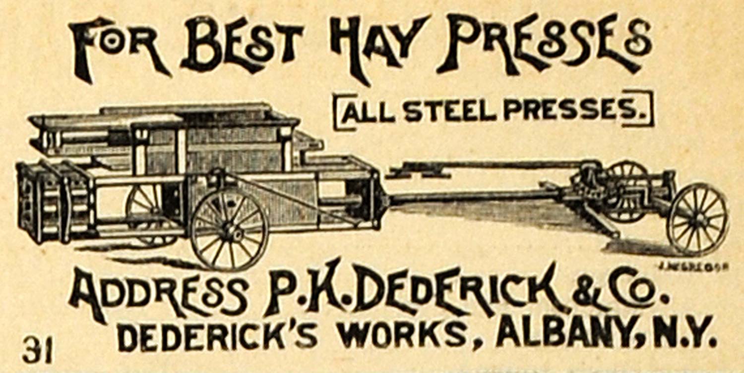 This is an original 1890 black and white print ad for All-Steel Hay Presses, a product by P. K. Dederick and Company, located in Albany, New York. This ad features Hay Press illustration by what appears to be J. McGregor.