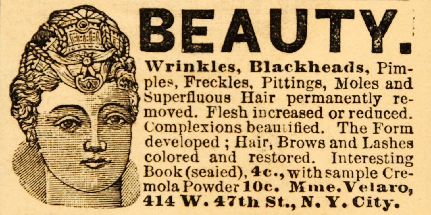 This is a small original 1890 black and white print ad for a sealed booklet with purchase of a sample of Cremola Powder to cure wrinkles, blackheads, freckles, pimples, moles, unsightly facial hair and more.