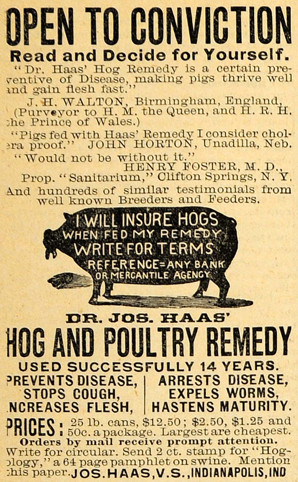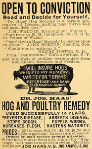 This is an original 1890 black and white print ad for Dr. Haas' Hog Remedy used in the prevention of disease, expelling worms, increasing flesh , stopping coughs and hastening maturity. This ad features testimonies by J. H. Walton of Birmingham, England, John Horton of Unadilla, Nebraska and Henry Foster of Clifton Springs Sanitarium in New York.