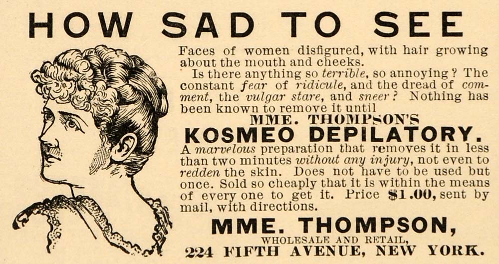 This is an original 1890 black and white print ad for Madame (Mme.) Thompson's Kosmeo Depilatory Cream, 224 5th Ave. New York, NY.