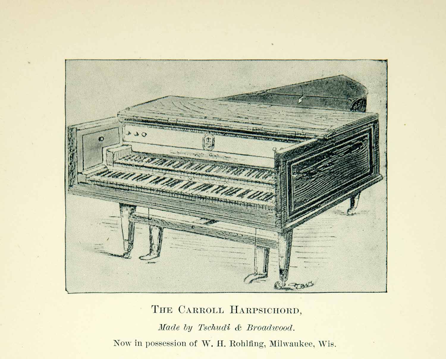 This is an original 1890 black and white halftone print of the Carroll harpischord that was made by Tschudi & Broadwood.